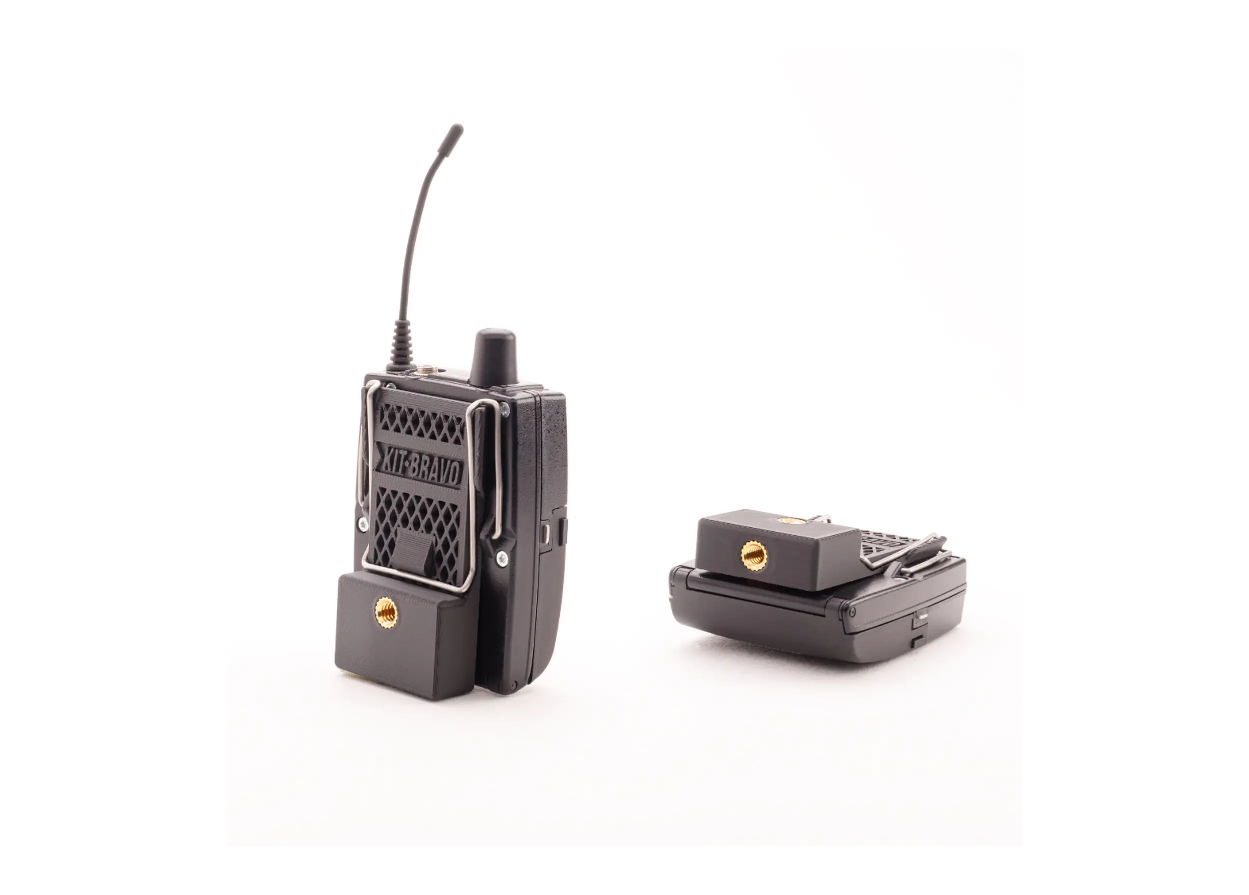 Le Transmitter Holder KIT BRAVO est un support rigide conçu pour fixer solidement des récepteurs HF professionnels sur un bras articulé, un pied ou tout accessoire équipé d’un filetage 1/4″ ».