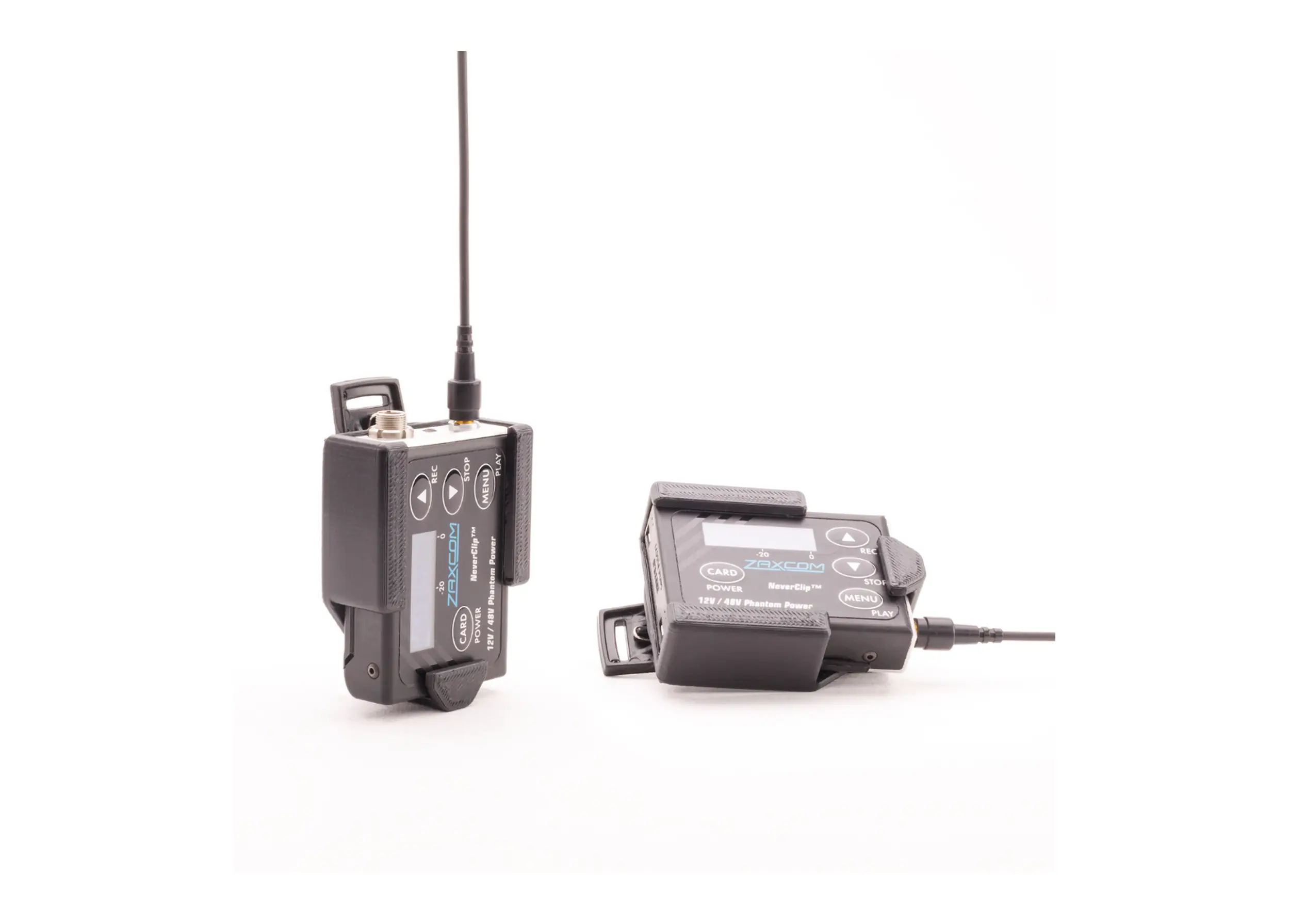 Chaque version est spécifiquement adaptée à un modèle de transmetteur précis (Sennheiser, Lectrosonics, Zaxcom), assurant un maintien optimal sans jeu ni contrainte mécanique sur le boîtier. Le clip permet d’orienter l’émetteur avec l’antenne vers le haut ou vers le bas selon les besoins, facilitant l’adaptation aux contraintes de tournage et de port.